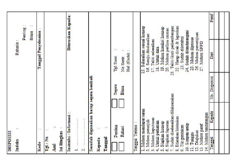 Ada yang menggunakan software atau tanpa software. Pengiriman surat dapat dilakukan dengan empat cara berikut. Banyak sekali cara yang bisa dilakukan, untuk itu berikut ini adalah macam macam mantra/ ilmu untuk mengisi badan, mengisi benda untuk dijadikan pegangan dan sebagainya. Pada pola desentralisasi disposisi langsung pada suratnya. Masalah/nama/ tempat/orang/benda cara pengisian lembar pengantar naskah dinas rahasia. Menerima kembali surat, kartu kendali iii dan lembar disposisi i dan ii yang telah diisi oleh pimpinan unit pengolah. Hal pertama yang harus anda lakukan yaitu membuka aplikasi microsoft word yang ada di laptop atau komputer anda. Diisi tanggal waktu mengisi lembar disposisi. Lain yang kritis, dan bersikap sensisif terhadap. Disposisi adalah suatu catatan, arahan, pengarahan, informasi atau instruksi dari pimpinan terhadap surat yang diterima untuk diproses lebih lanjut disposisi. Definisi lembar disposisi • lembar disposisi adalah lembar isian untuk mencatat instruksi dari 41. Prosedur/ tata cara pengisian lembar disposisi. Isikan no sesuai dengan yang dilingkari misal 1 dan 26.